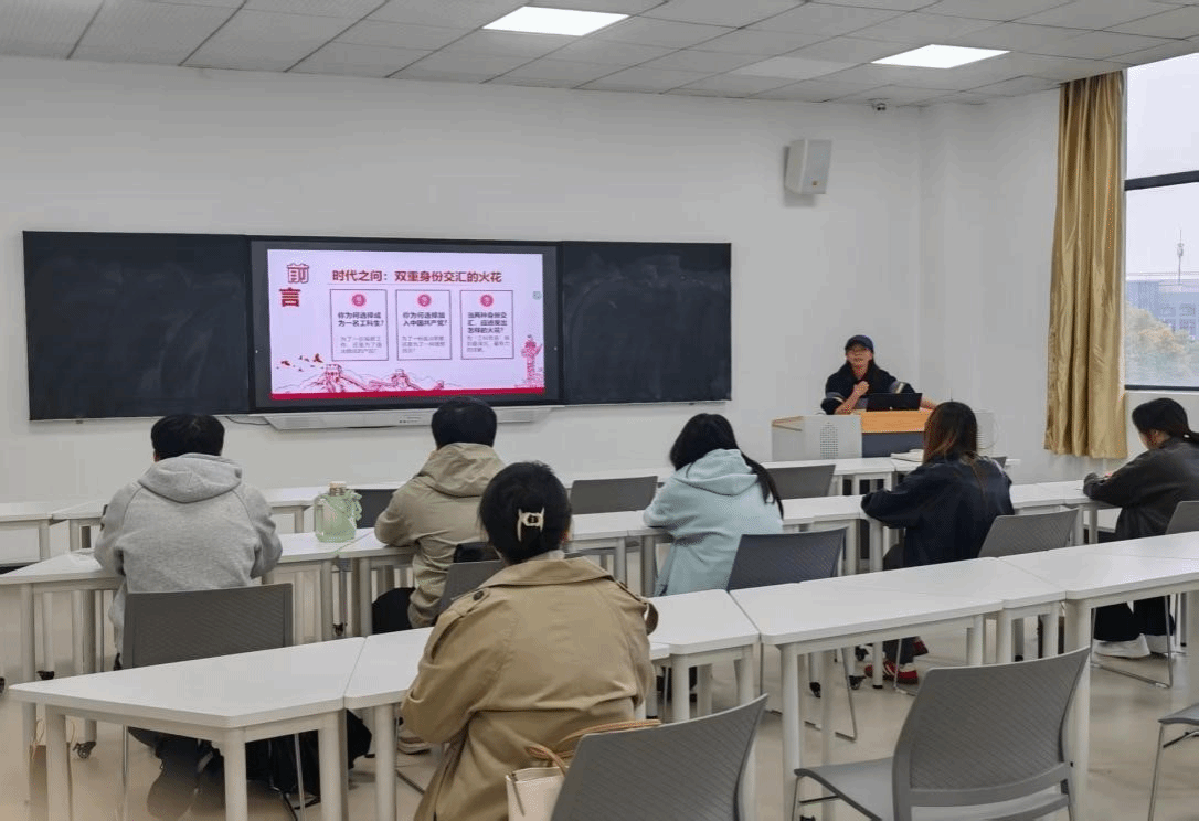 党课伊始,主讲人田老师以三个发人深省的“时代之问”破题:“你为何选择成为一名工科生?”“你为何选择加入中国共产党?”“当两种身份交汇,应迸发出怎样的火花?”这一连串直击心灵的提问,引导在座学子深入思考工科与党员双重身份所承载的时代内涵,确立了“身份融合、价值共生”的课程基调。