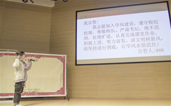 随后,我院同学在17级王紫逸的带领下,宣读如下学风誓词:我志愿加入学风建设,遵守校纪校规,尊敬师长,严肃考纪,绝不迟到,杜绝旷退,认真完成课堂作业,积极上进,努力奋发,讲文明树新风,将坚持进行到底,让学风永留武传!